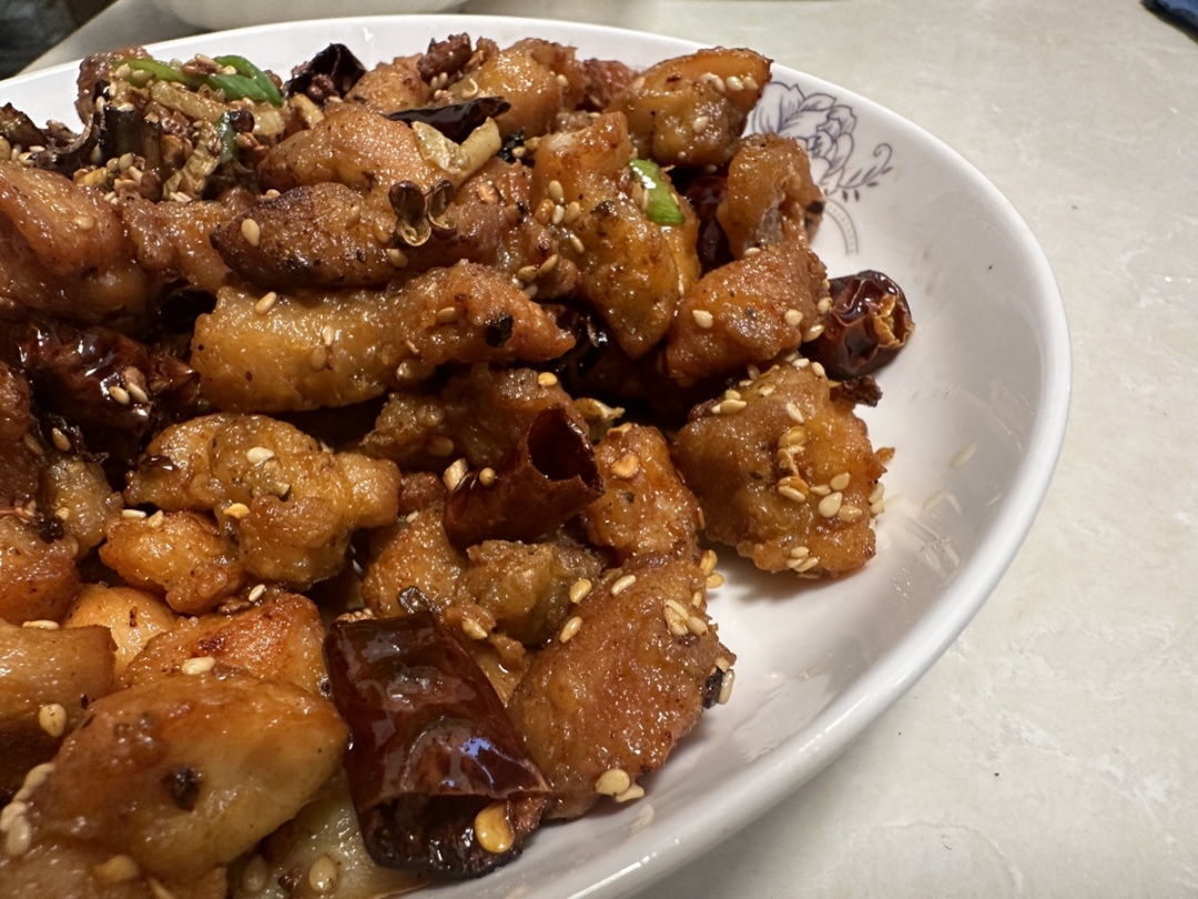 准备食材:鸡腿肉、料酒、生抽、盐、胡椒粉、鸡蛋、淀粉、葱、姜、蒜、干辣椒段、花椒、白糖