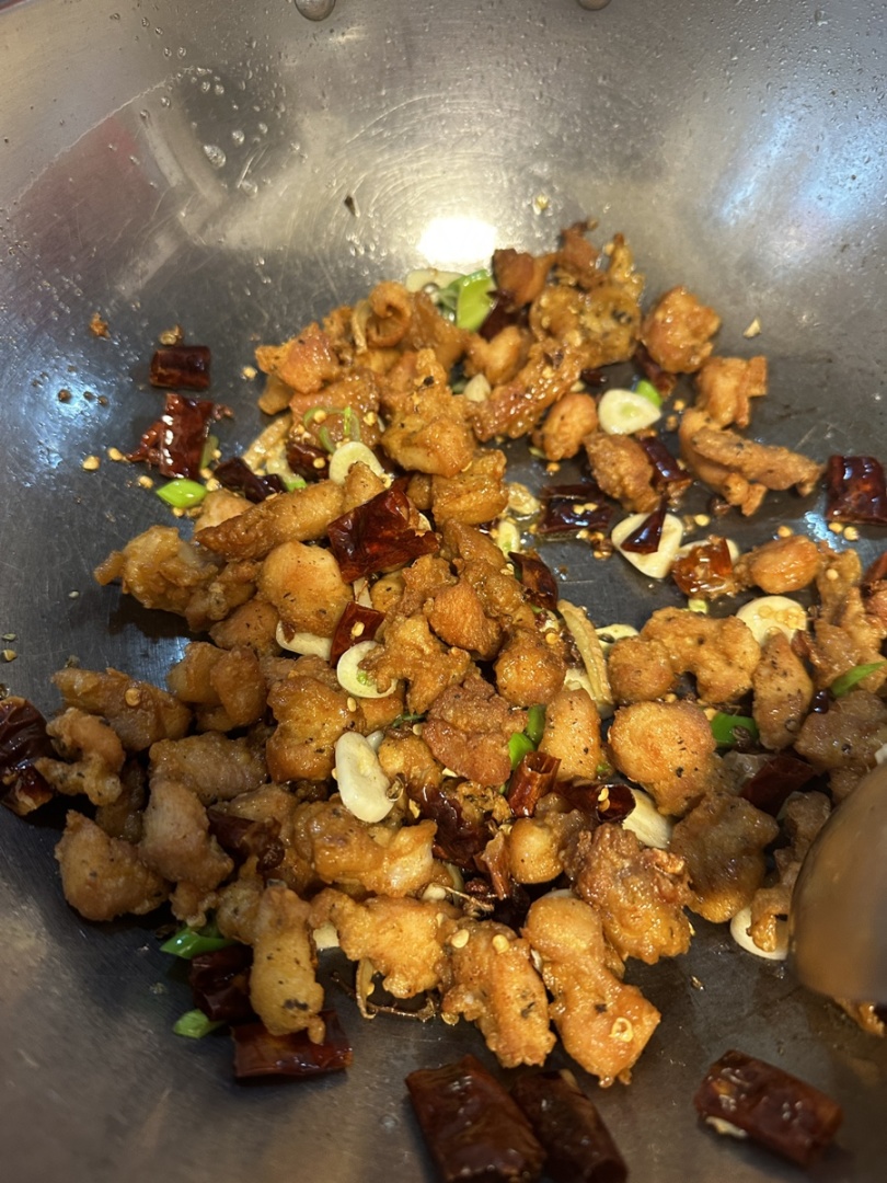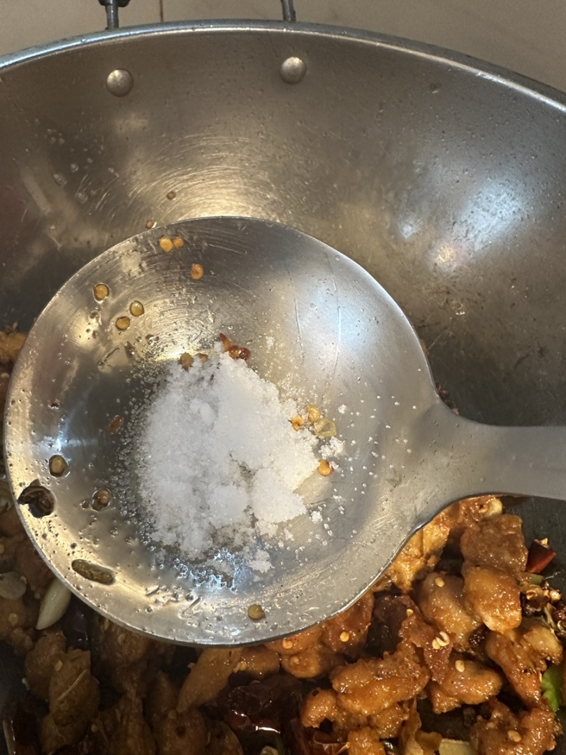 5.倒入鸡丁,加入盐、白糖翻炒入味