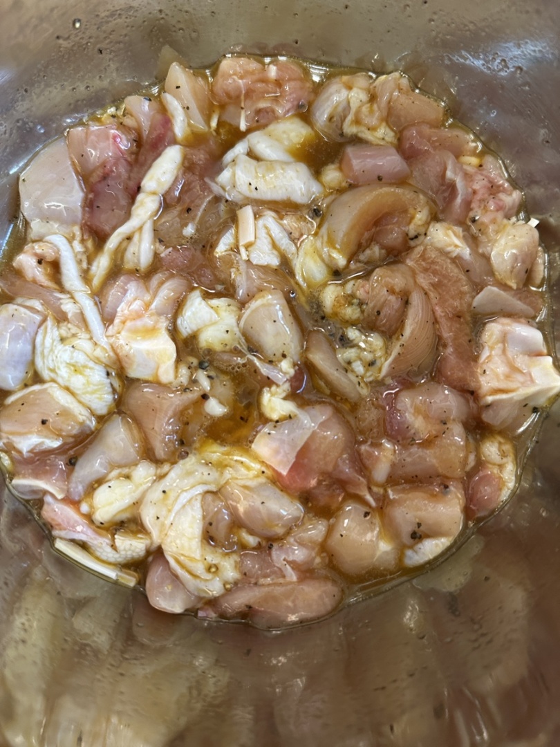1.鸡腿肉去骨切丁,加入1勺料酒,1勺生抽,1小勺盐,适量胡椒粉,1个蛋黄
