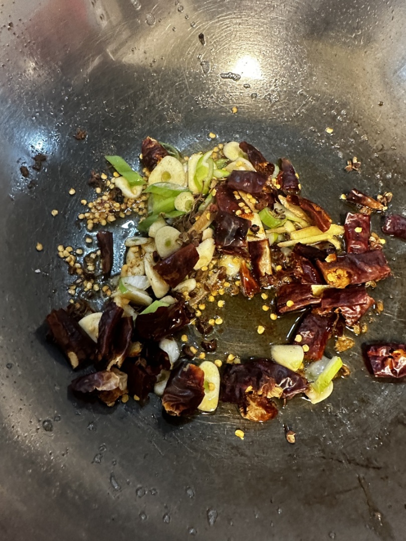 4.起锅烧油,放入葱姜蒜、干辣椒段和花椒,翻炒出香味