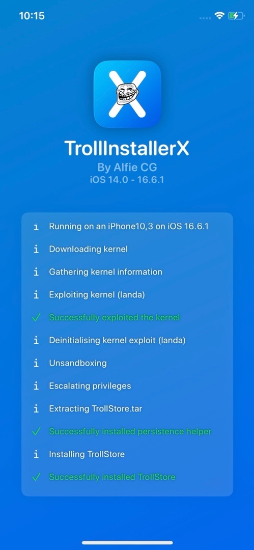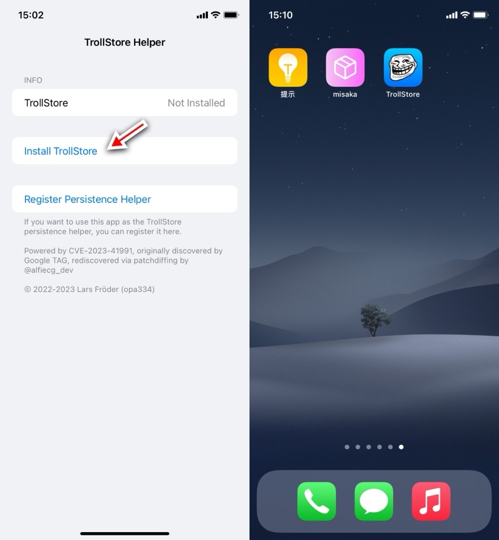 如果:你是iOS 16.5.1 ~ 16.6.1的 A15、A16 和 M2 處理器設備,步驟還沒有完成,打開設備上的提示app,點擊Install TrollStore,完成巨魔商店的安裝。