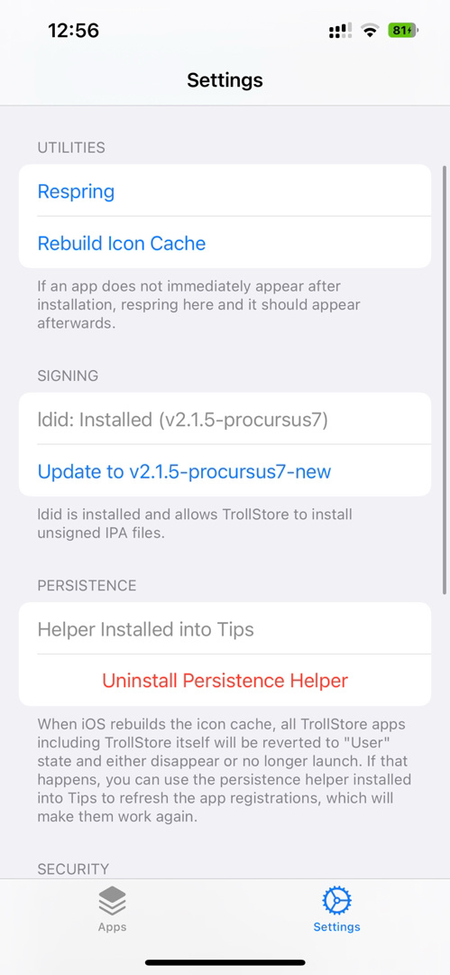 8. 返回桌面,打開桌面藍色巨魔圖標Trollstore,自動安裝ldid,如果沒有,底部Setting點進去,點擊install ldid(如果沒有看到install ldid,就是已經安裝好了)。