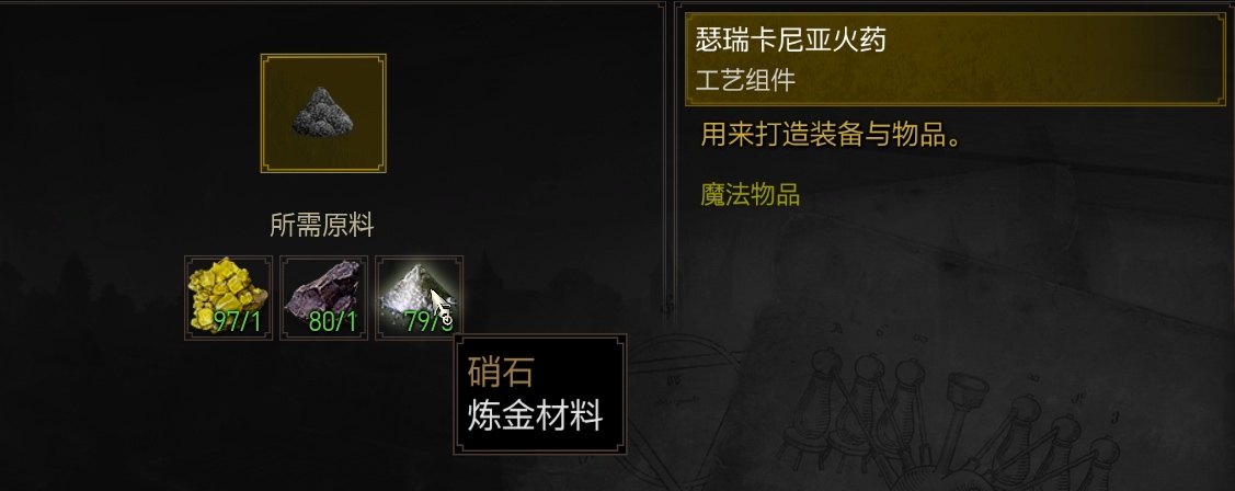 彈藥的製作:彈藥的合成需要子彈和瑟瑞卡尼亞火藥(任何工匠都會製作彈藥,子彈和火藥,只要你有材料。並且瑟瑞卡尼亞火藥可以在鍊金物質欄中進行合成)