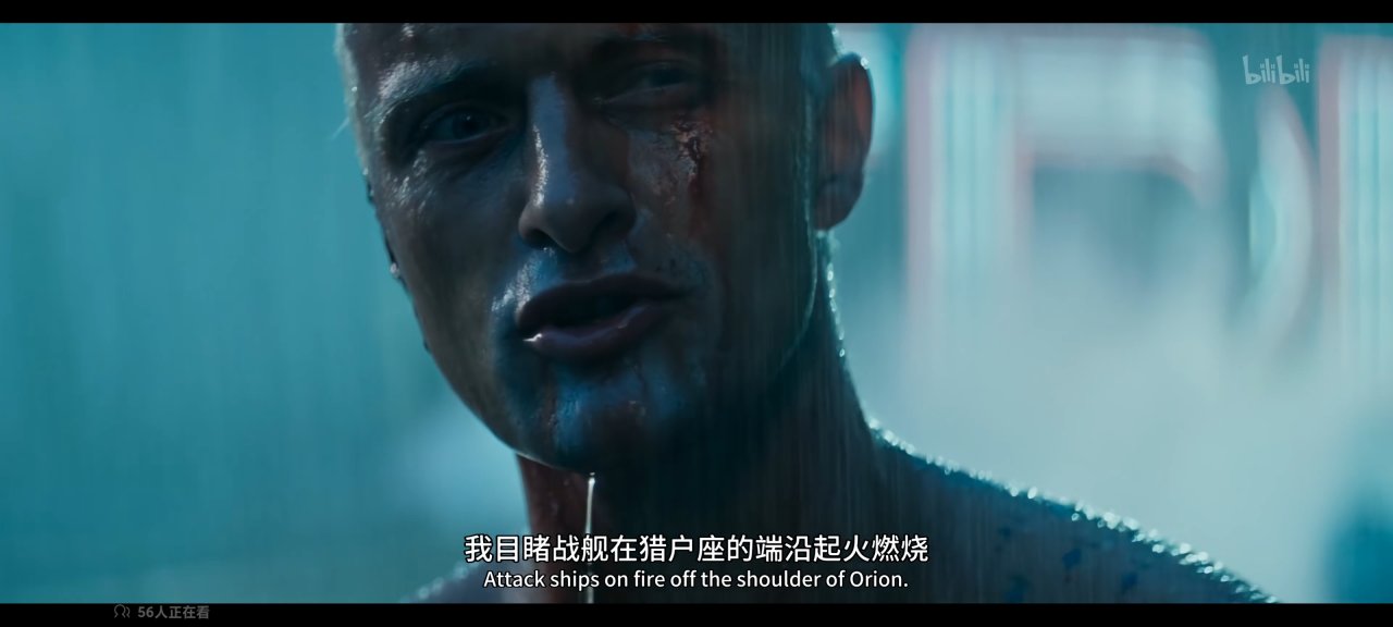1:46:30-“我見過...你們這些人不會相信的事。我目賭在獵戶座的邊緣着火的攻擊艦。我看見C射線在湯豪色星門附近,在黑暗中閃亮着。所有這些時刻都會消失...於時間中,一如眼淚...消失在雨中。死期到了。”