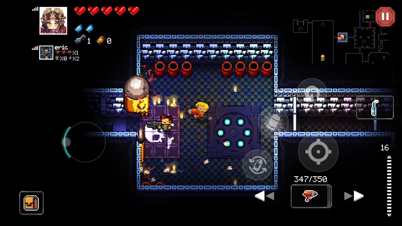 手遊端因此特別開發了線上雙人聯機模式。玩家可以遠程自由創建房間,或是邀請好友一同挺進地牢。從手遊宣傳視頻的片段來看,聯機不再侷限於本地同屏,並且有了更多樣的雙人陣容出現。搭配不同屬性技能的英雄並肩作戰,或許在槍牢中能夠打出更意想不到的配合。