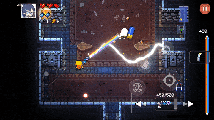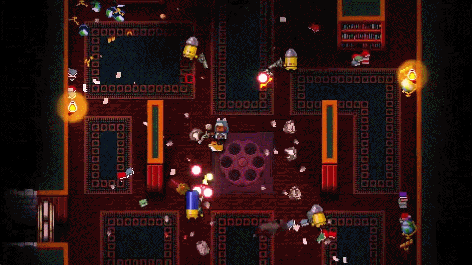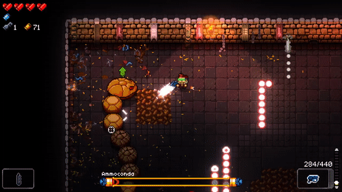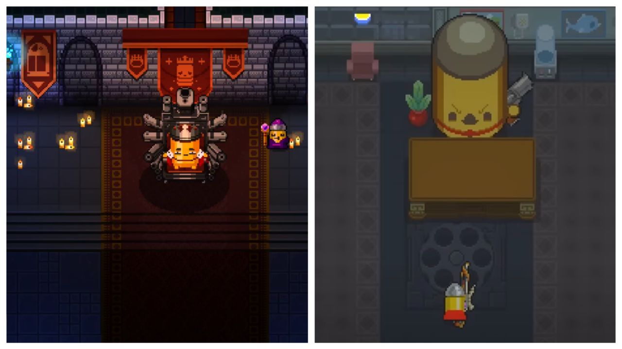 基於天馬行空的槍彈意象整活,細膩生動的像素動畫將遊戲的風格化體驗更升一層——直至今天美術水準仍毫不露怯。製作組甚至爲每把槍都設計了細緻的換彈動畫。從角色玩家流暢靈動的射擊翻滾,到小怪boss們華麗豐富的動作設計,通過成千上萬精細製作的動畫幀,槍牢真正塑造了一個自成一派、沉浸感十足的奇幻世界。