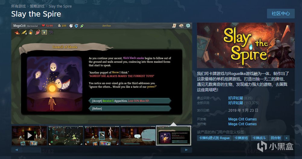 《殺戮尖塔》(Slay the Spire)是一款於2017年由Mega Crit Games製作發行的一款卡牌類Roguelike遊戲,手遊版名爲《尖塔奇兵》。開發商將卡牌與“肉鴿”合二爲一,玩家在每局遊戲中需要靠着隨機獲取的卡牌與道具來組建自己獨一無二的卡組來進行對戰,目標則是爬到塔頂逃出生天。