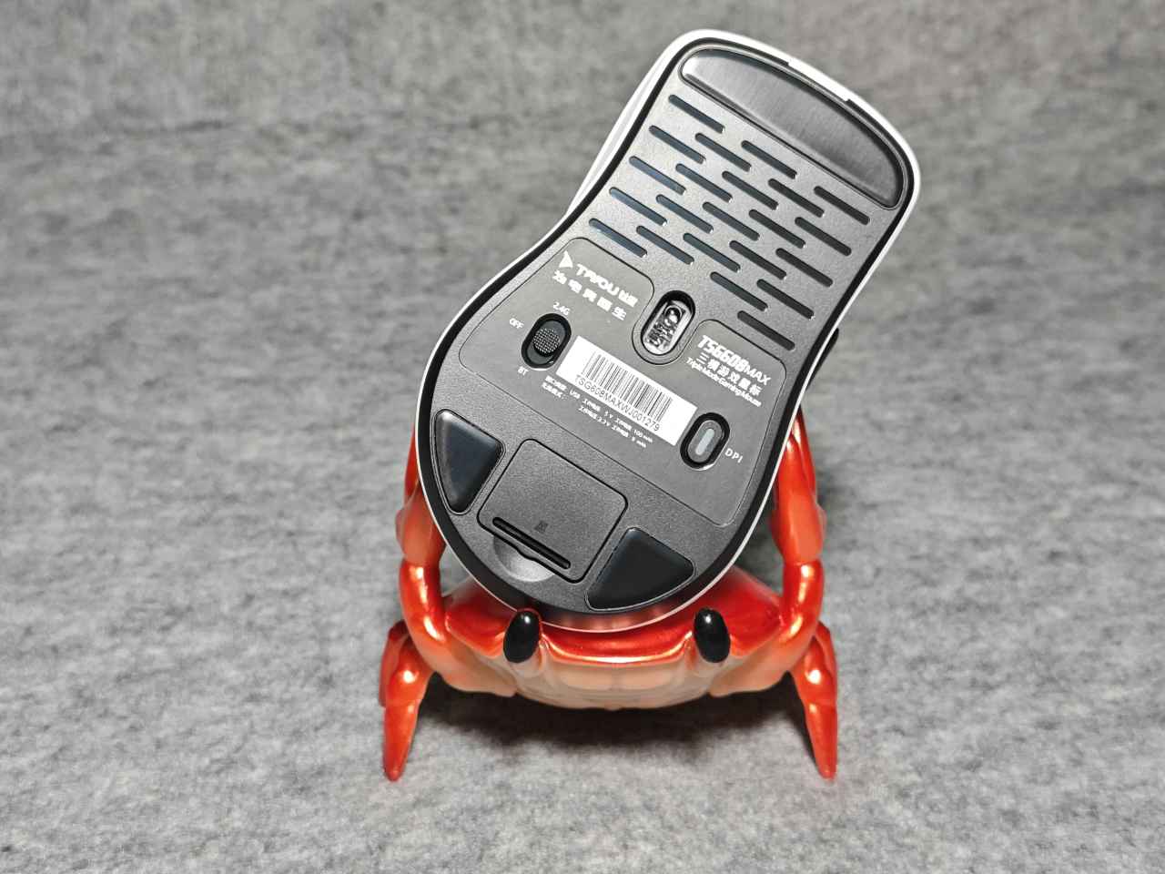 来到鼠标的底部,底部采用了3块超顺滑的铁氟龙脚垫,最下方位置是一个2.4g接收器的收纳仓,底部一共有2个按键,分别是三模切换按键跟DPI调节按键。设计语言非常简洁。