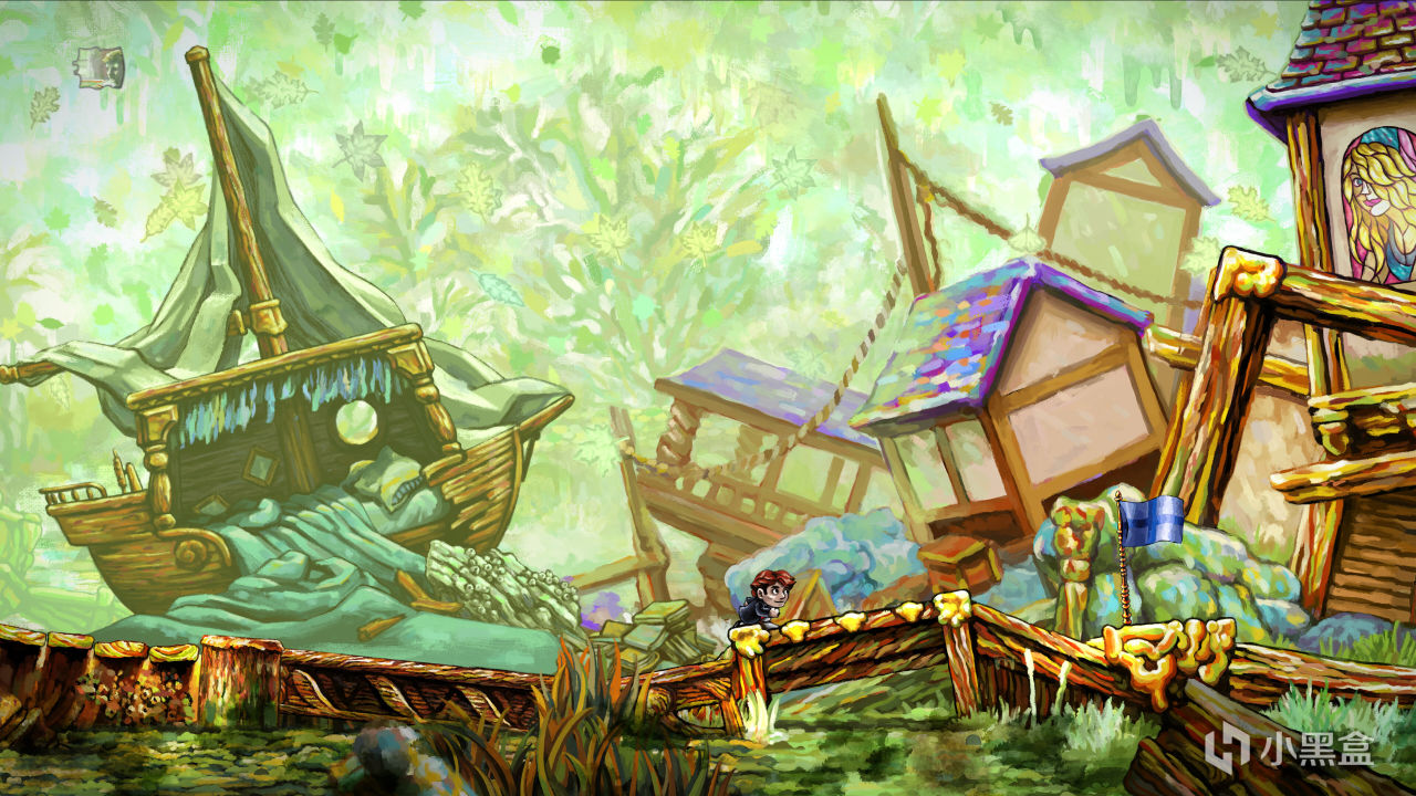 不過,真正讓《時空幻境》熠熠發光的還是其核心玩法。遊戲中充斥着各種精心設計的 2D 平臺關卡,巧妙的謎題要素層出不窮,而收集的拼圖碎片則往往揭示了關卡的核心機制。筆者十餘年未曾接觸過原作,再次遊玩時依然對關卡設計的高超水準感到讚歎。每一個關卡都經過精心雕琢,小巧緊湊,同時又會引入全新的時間操控變量。