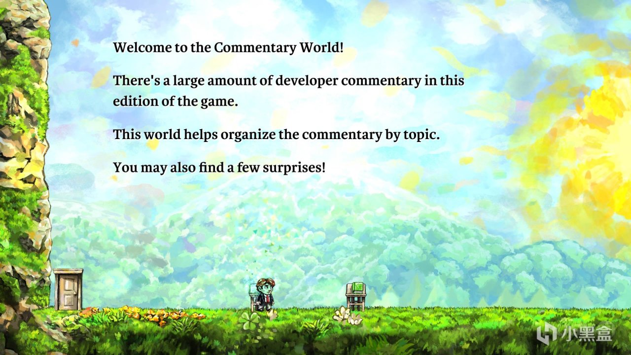 還是坦白地說吧,其中相當一部分“評論”內容對我而言並不感興趣,但我尊重開發團隊的堅持,因爲我相信這些內容對於對相關議題感興趣的人士而言一定大有裨益,無論是《時空幻境》的鐵桿粉絲,還是初出茅廬的遊戲開發者,都可以在其中有所收穫。玩家可以在主菜單中進入“評論世界”,並需要手動觸發關卡中出現的每一處對話。“評論世界”作爲週年紀念內容可謂誠意十足,爲特定玩家羣體提供了額外的深度體驗。玩家還可以選擇在普通遊戲中加入精選的“評論”進行遊玩。