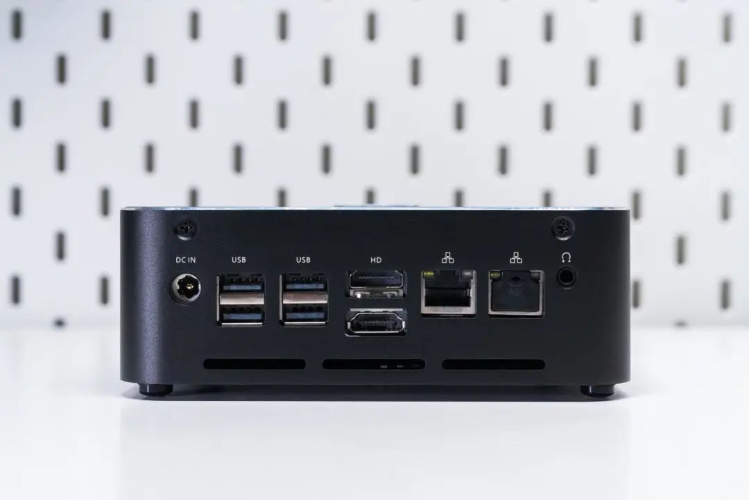 接口部分,机身前面板提供了两个USB 3.0 Type-A接口和一个USB 3.0 Type-C接口,其中Type-C接口还支持PD供电标准,可以为用户的移动设备快速充电。机身后方I/O面板上提供了四个USB 3.0接口、两个HDMI 1.4接口(处理器内置7A2000桥片最高支持4K/30Hz输出)、一个3.5mm音频输出接口和两个千兆有线网络接口,供电则搭配的是19V/120W适配器。实际上,M700S还支持Wi-Fi 5无线网络+蓝牙5.0,只不过没有采用外置天线设计而已。