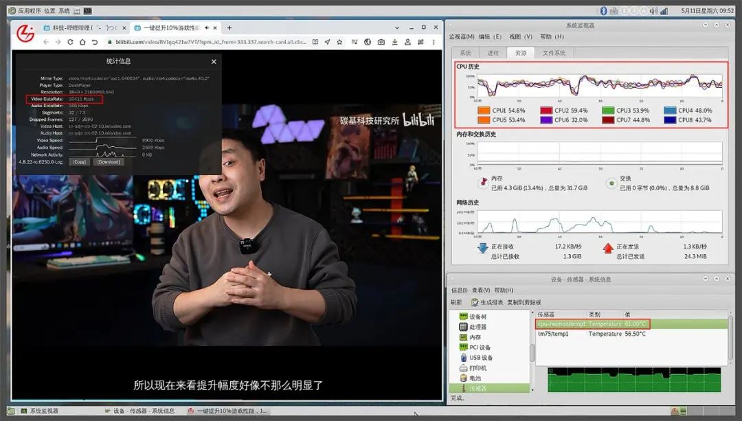 影音娱乐方面,观看4K视频自然是很多用户特别看重的。我们用M700S在线观看B站4K视频,码率在10000Kbps左右。可以看到处理器各个核心的实时占用率最低32%,最高59.4%