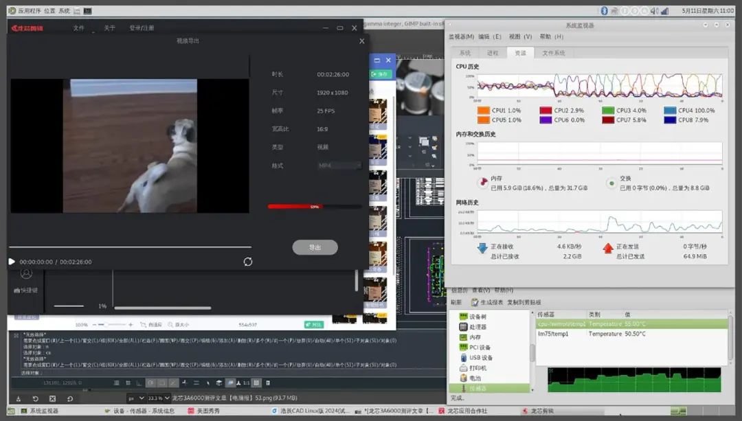 那么M700S面对压力更大的生产力应用又如何呢?我们同时打开了浩辰CAD、GNU图像处理软件、美图秀秀和龙芯剪辑,模拟在视频导出、图片编辑、CAD制图应用之间来回切换工作,实际体验也达到了流畅的水平。从资源监视器可以看到龙芯3A6000的各个核心在轮换调配工作,从而保证最优化的执行效率。此外,我们也观察到,M700S在完成视频转码等重载工作时的整机功率也只在50W~58W之间,不仅节能,散热和供电要求也是非常宽松的。由此可见,搭载龙芯3A6000的M700S完全可以搞定日常办公和轻度生产力应用需求,完全可以替代当前主流X86迷你办公电脑。