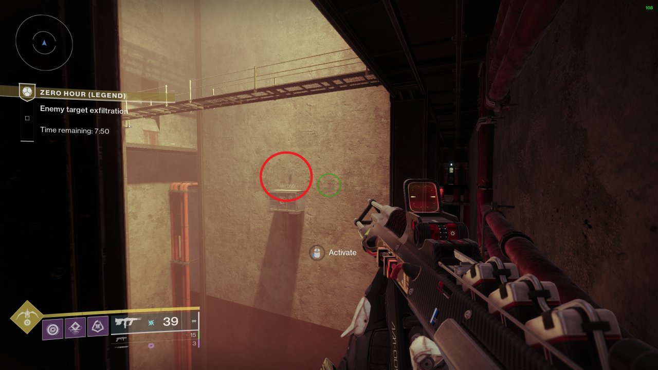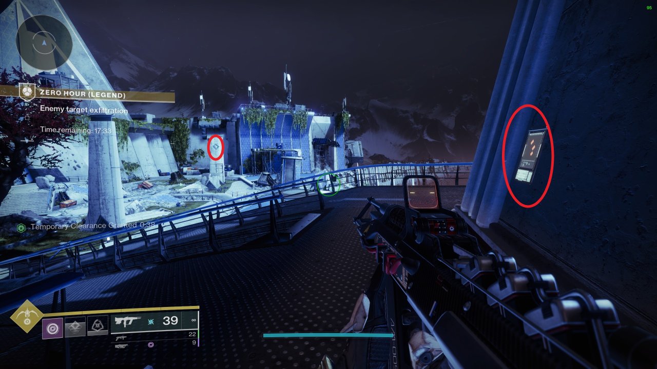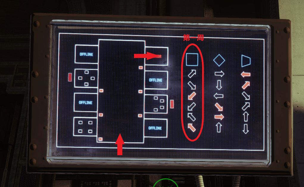 在第二個戰鬥區域裏,入口通道的二樓牆上有可以互動的面板,互動後根據面板,使用【全面爆發】按順序射擊對應圖標,下圖爲面板及圖標1位置: