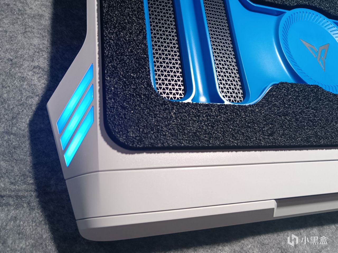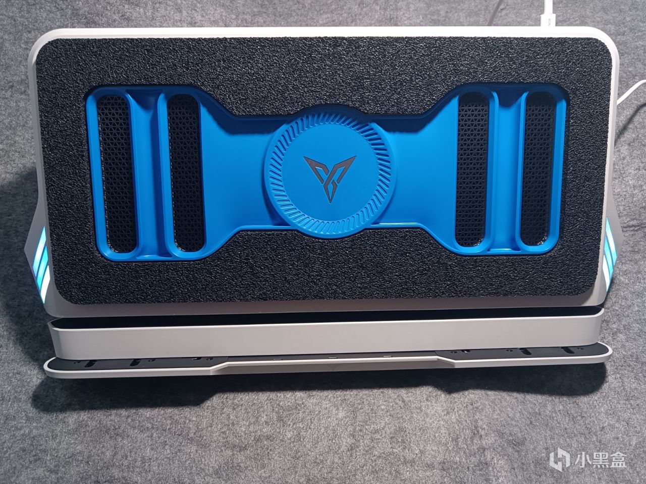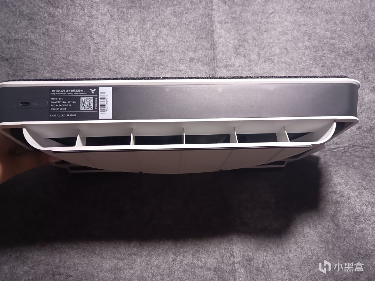 凸出的半圆部分其实是用来进风的,布置在这个位置就很少有东西能挡住进风口了,然后大家也都知道,这种压风式的散热底座拉满功率的情况下基本上噪音都是很大的,飞智是专门做了两个降噪的设计,一个就是进风口,采用消音炮筒结构,另一个就是内部风道设计采用了整流格栅,在两个设计的加持下,最大档位的噪音虽然不能说小,但至少也是一个可以接受的级别,当然了,周围有人睡觉的话还是不要开最大档位,避免挨打。