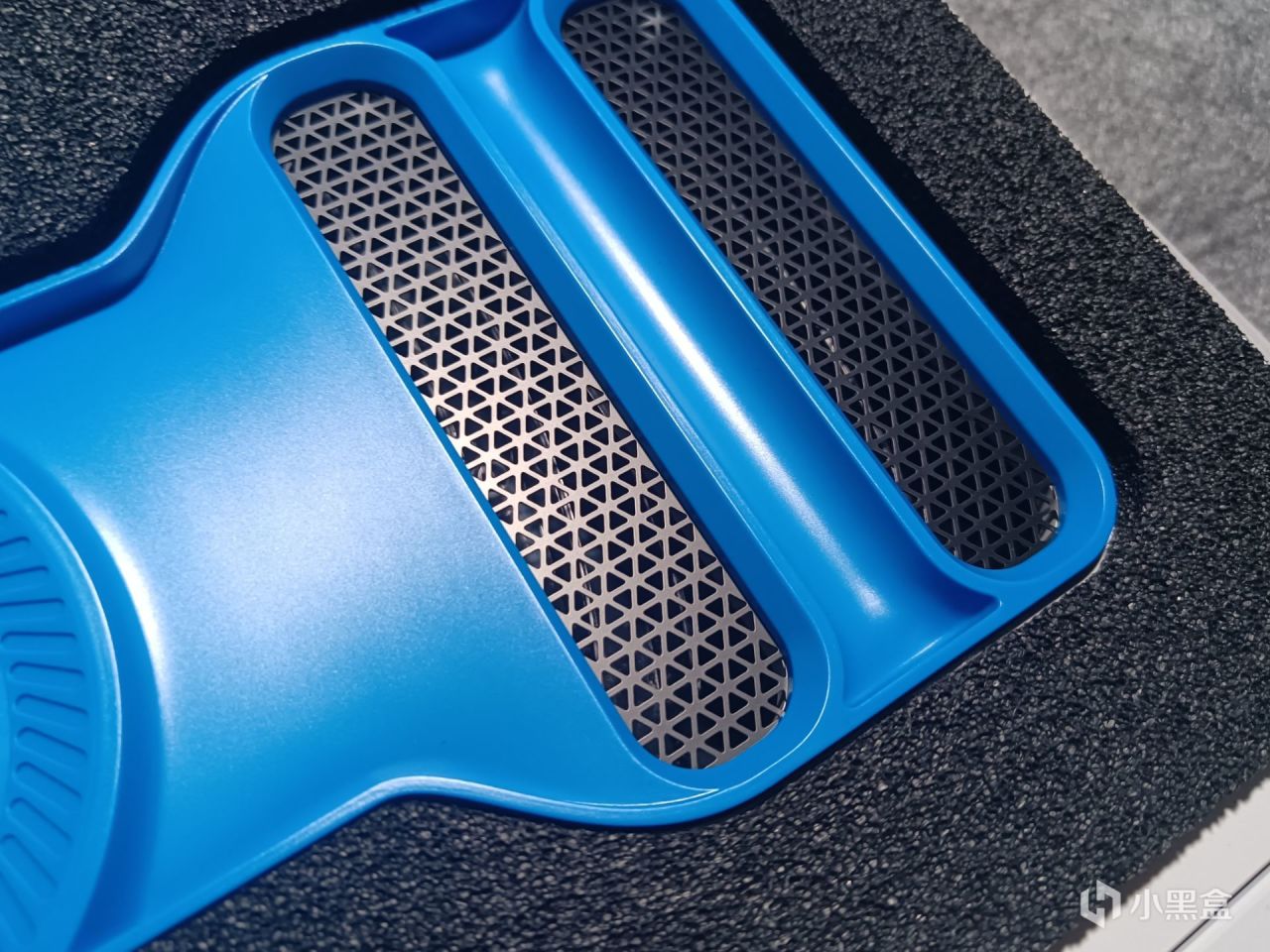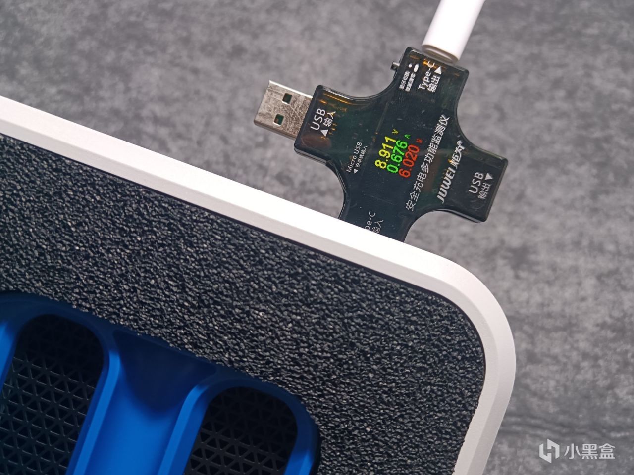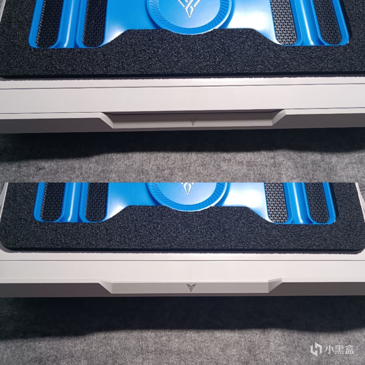 凸出的半圆部分其实是用来进风的,布置在这个位置就很少有东西能挡住进风口了,然后大家也都知道,这种压风式的散热底座拉满功率的情况下基本上噪音都是很大的,飞智是专门做了两个降噪的设计,一个就是进风口,采用消音炮筒结构,另一个就是内部风道设计采用了整流格栅,在两个设计的加持下,最大档位的噪音虽然不能说小,但至少也是一个可以接受的级别,当然了,周围有人睡觉的话还是不要开最大档位,避免挨打。