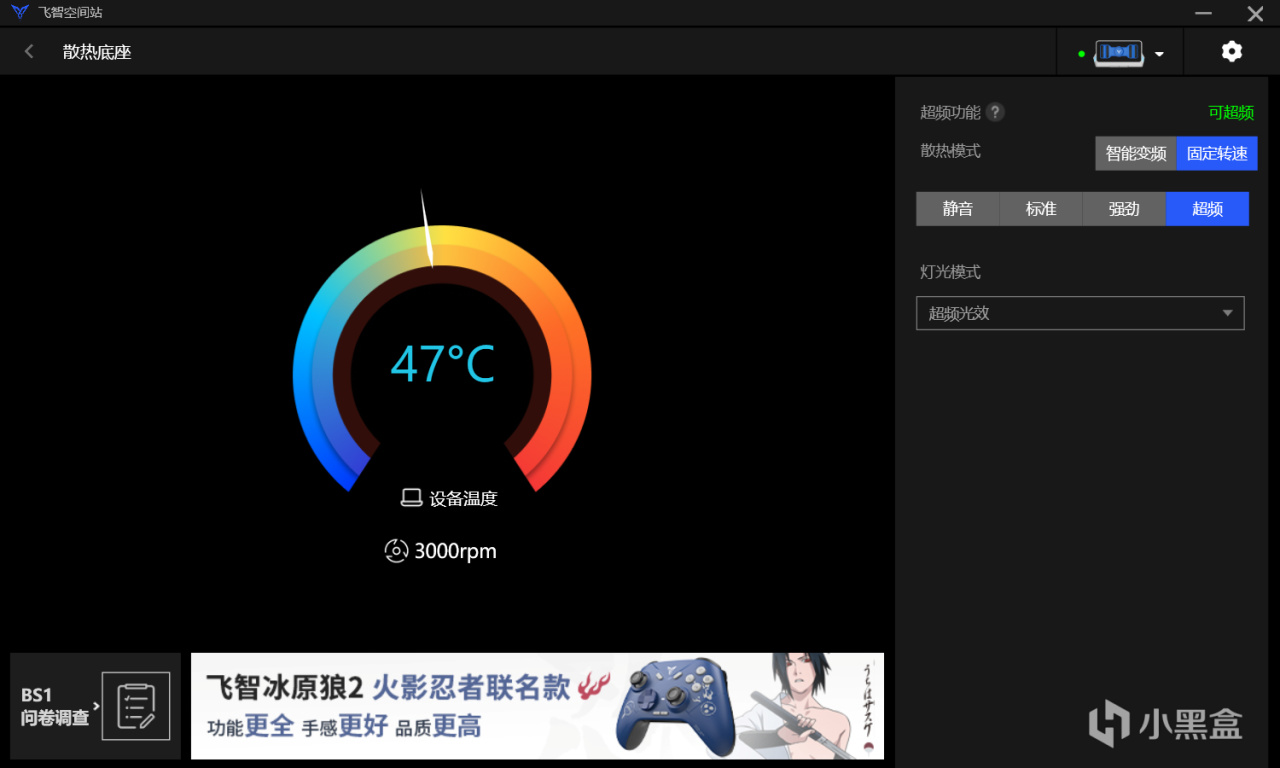 使用的时候还可以在飞智空间站3.3中调节为智能变频模式,根据电脑的温度进行风速的调节,大家也可以在这里看到实时的温度以及散热底座风扇的转速,使用体验很不错。