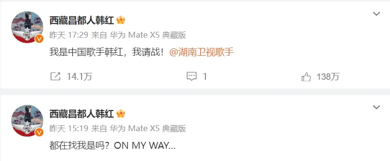 老大姐韓紅坐不住了,直接發了一條微博:我是中國歌手韓紅,我請戰!