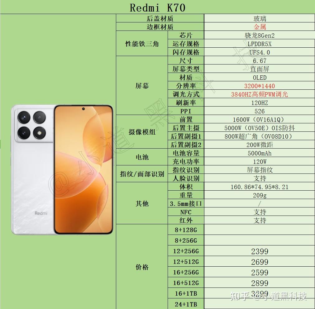 简评:红米K70综合表现不错,配置均衡没明显缺点,影像给到光影猎人800+小米影像大脑成片效果不错,可选配置也很多,性价比高!