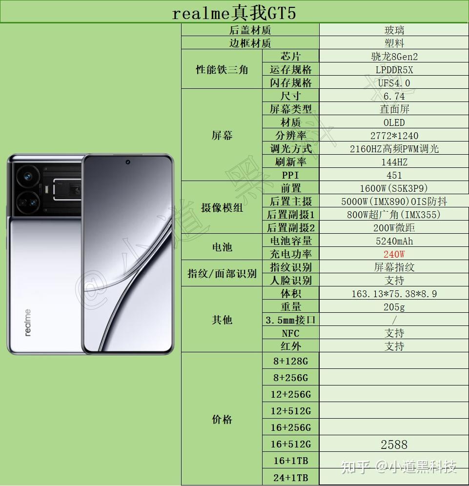 简评:realme真我GT5现在只有240W快充版本在售,并且有货的配置只有16+512G版本,想体验极速快充的就非常适合入手,其他方面的配置表现也可以。