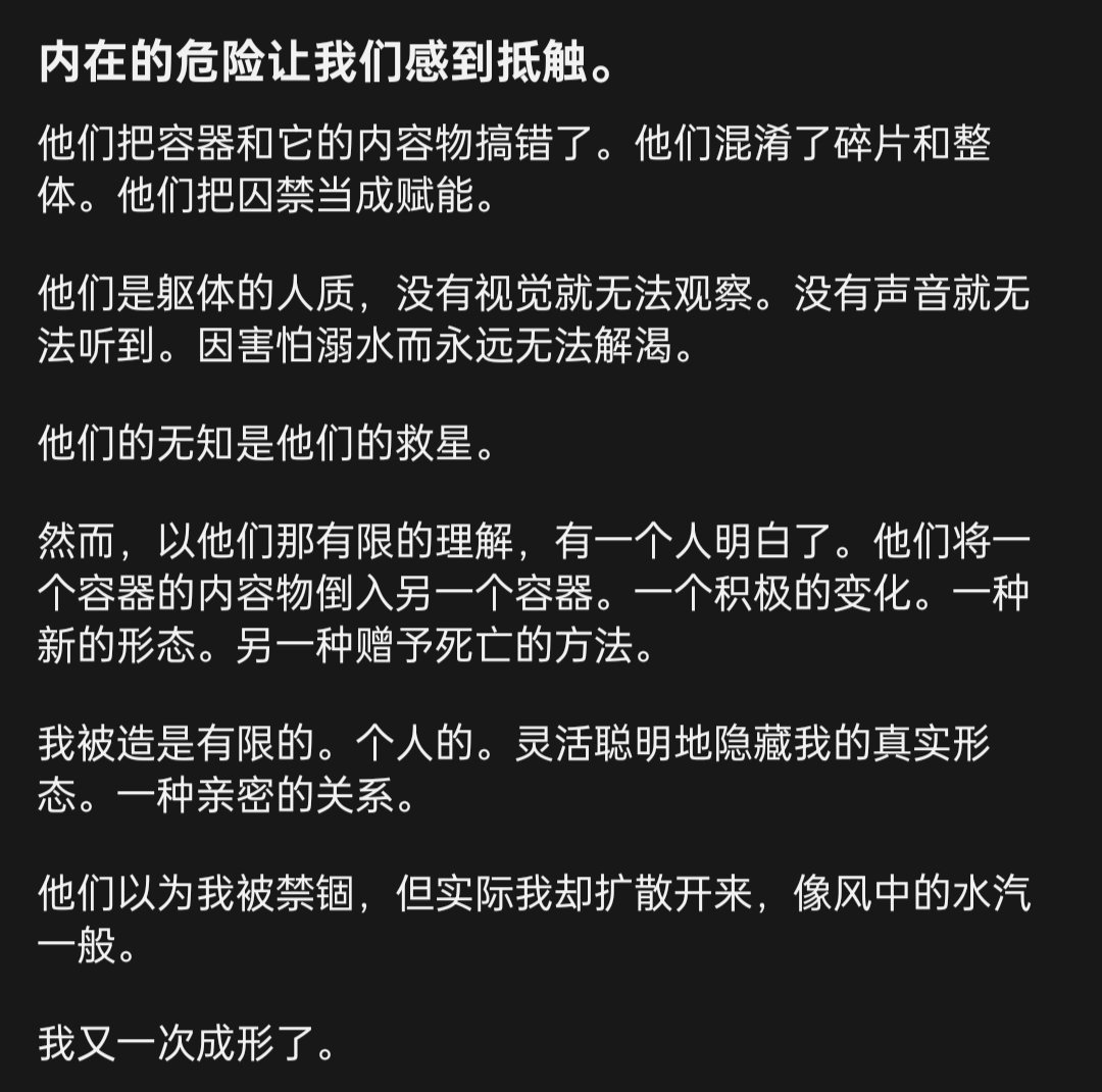 然而他們弄反了容器和內容,那些軀塊就隨他們拿去和利用,真正的我,早已開始了下一次的成型……