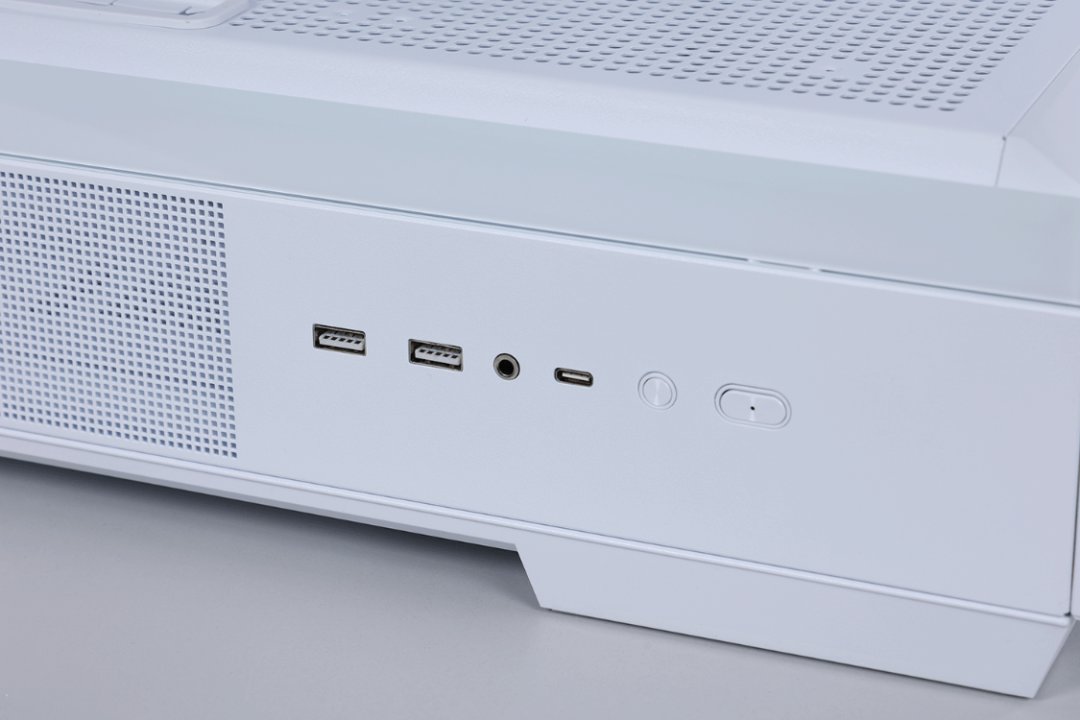 I/O面板位于机箱侧面底部,包含:2个USB 3.0、1个Type-C 10Gbps数据接口、1个二合一音频输入输出口、1个开机、1个重启按钮。