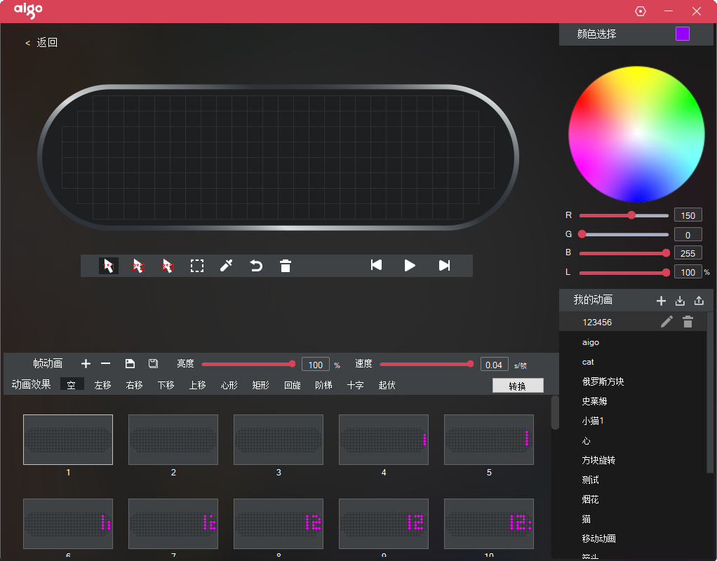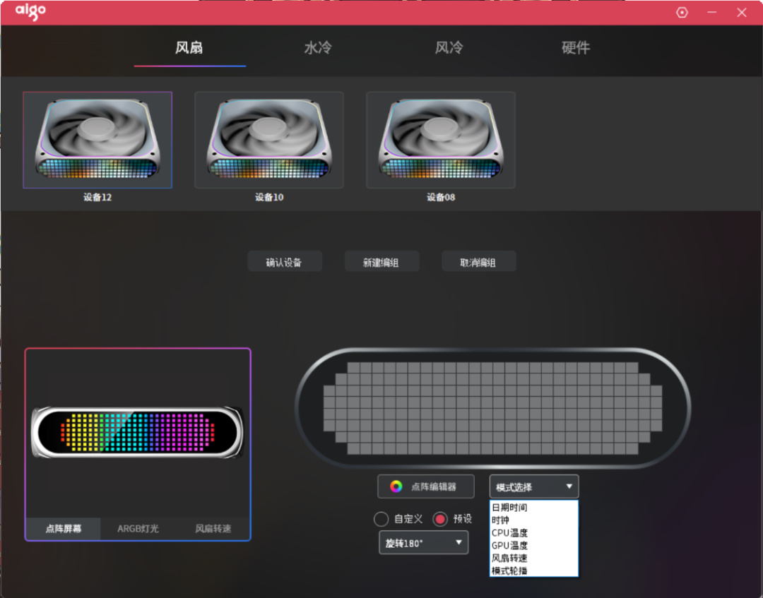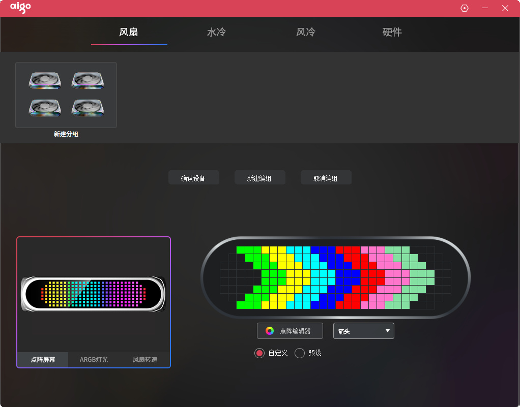通过配套的软件,我们可以对水冷的风扇进行单独或编组控制。软件内置了多个点阵屏幕预设动画,我们可以在自定义界面中选择喜欢的预设动画,也可以在点阵编辑器界面中自己制作喜欢的动画效果;
