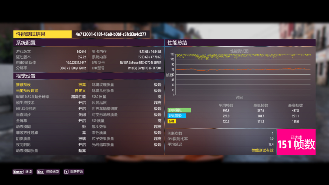 《极限竞速·地平线5》测试,极端画质,极端光追,开启DLSS 3.0并设为超级性能模式,4K分辨率下,游戏平均帧数151 FPS;