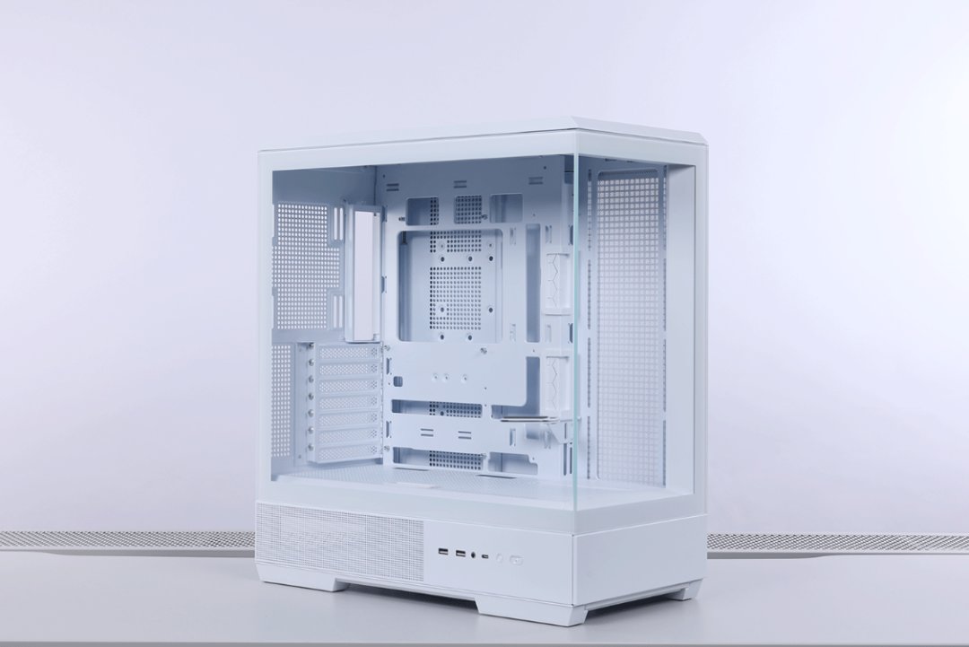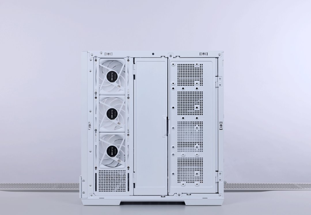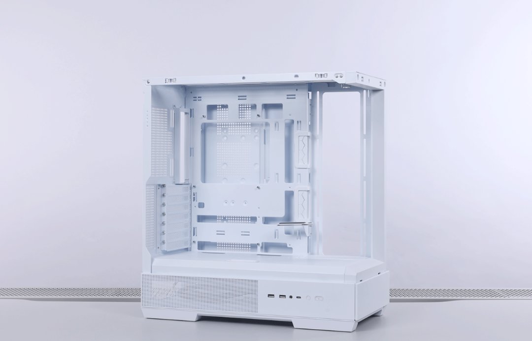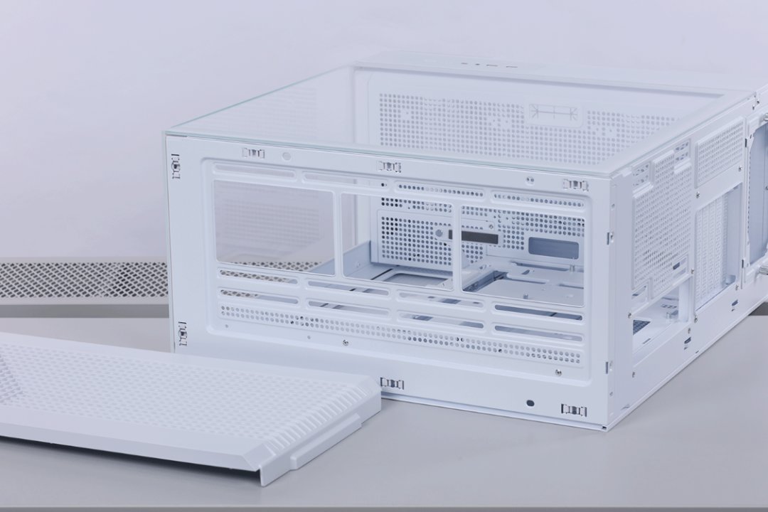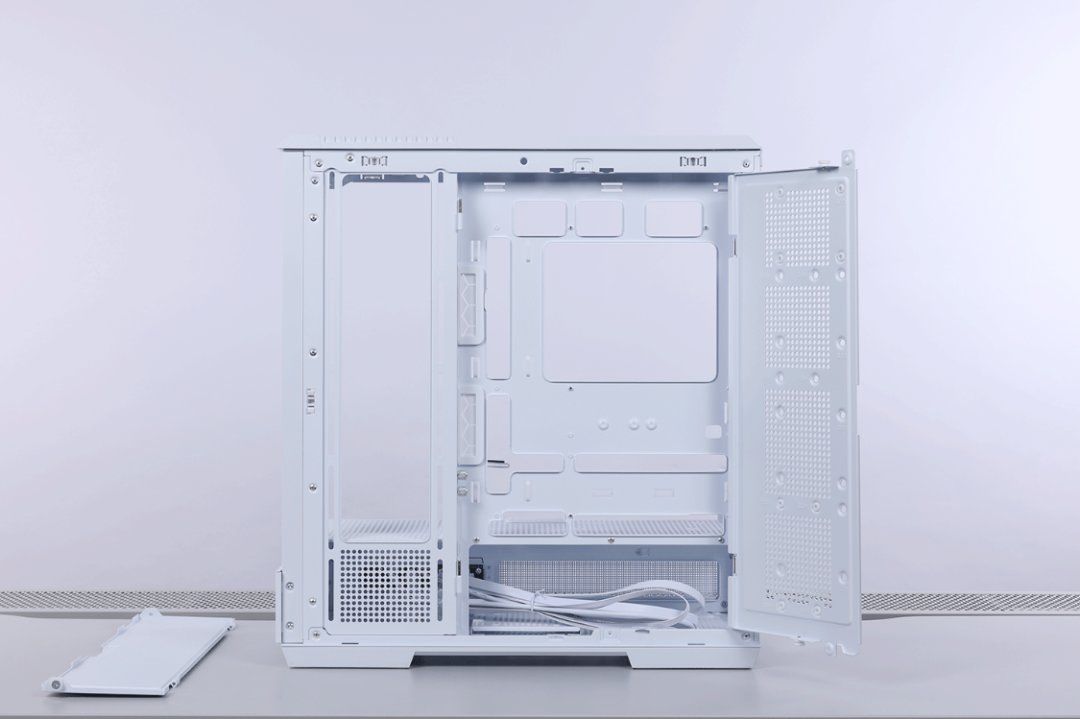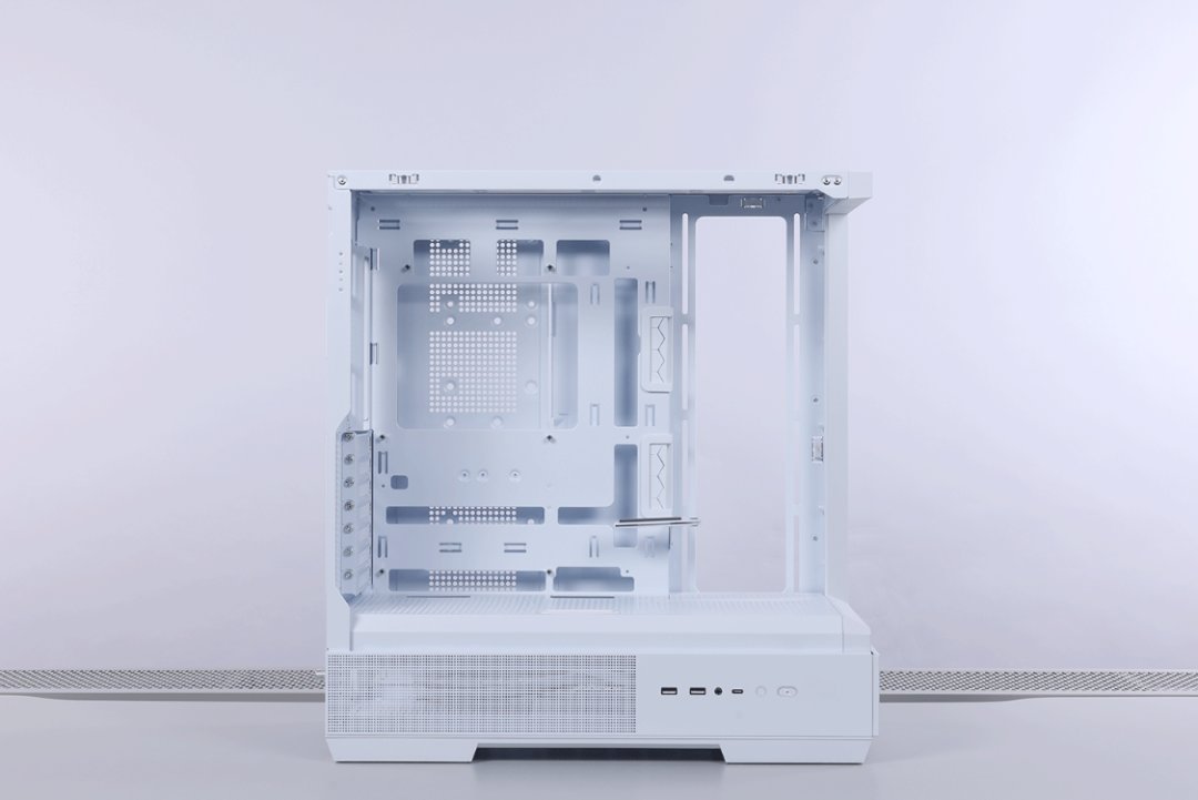 机箱采用4面(两侧板、顶盖、前面板)快拆设计,可以大大降低装机跟日常维护清理难度。机箱。机箱右侧金属面板、顶部、底部以及电源仓位置都有大量散热开孔设计,可以有效保证机箱内部进出风效率。