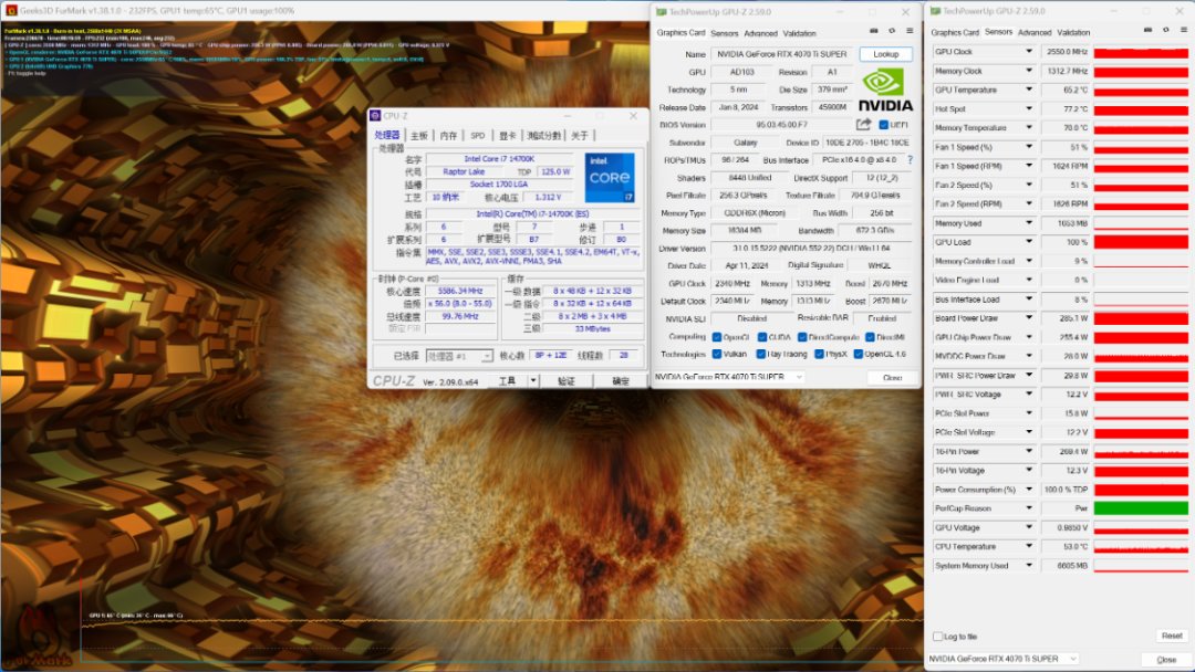 FurMark烤机测试,烤机15Min,显卡温度为65°左右,显卡功耗为285W左右;