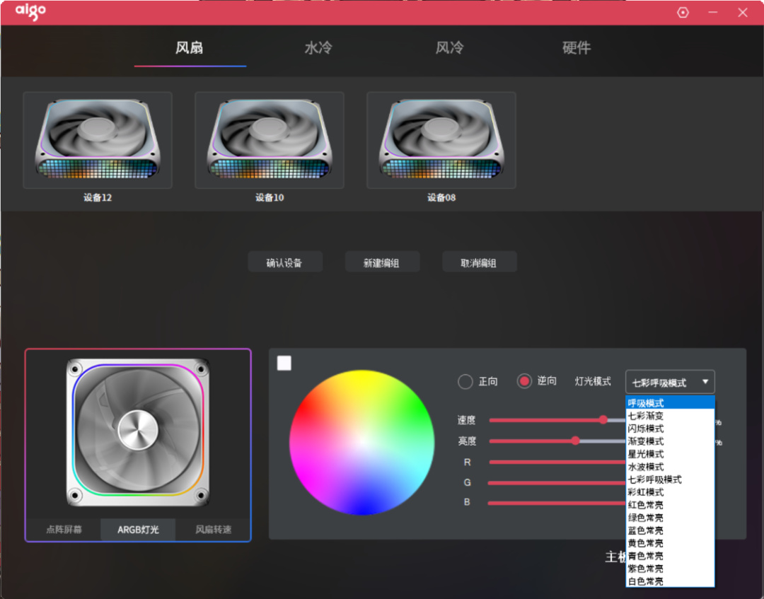 同时,在ARGB灯光界面中,还能调节风扇边框处的ARGB灯环灯效,自定义编辑ARGB灯效的方向与速度,也可以直接使用主板灯控软件进行一键控制。也可以在风扇转速页面中,调节风扇运行模式与转速曲线,也可以直接使用主板PWM一键管理。