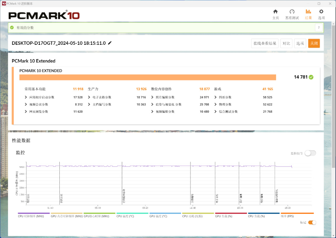 PC Mark Extended整机测试,整机得分14781分,常用基本功能得分11918分,生产力得分13926分,数为内容创作得分18877分,游戏得分41165分;