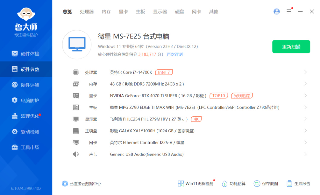 完整配置单:Intel i7-14700K处理器、微星MPG Z790 EDGE Ti MAX WIFI主板、影驰RTX 4070Ti Super 星曜OC显卡、HOF Extreme D5-7200MHz 24G*2内存、星曜7000 Plus 1T M.2固态硬盘、爱国者星璨大岚白色海景房机箱、星璨魔方360 白色一体式水冷、ES850 ATX3.0白色金牌全模组电源、岚月白色ARGB风扇*7...早买早享受,还有机会跟我一样白嫖爱国者月红红定制键盘、抱枕跟定制礼包。
