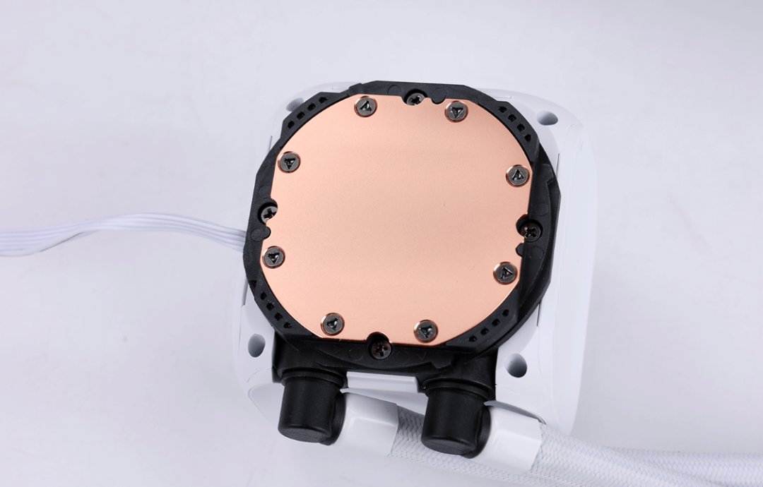冷头底部是一整块大面积精雕纯铜底座,可以更好地贴合CPU。冷头内部的高转速静音马达则采用了陶瓷轴心,最大可达3000±10%RPM的转速,可以快速将底座上的热量传入冷排,加快冷排内部水冷液的热交换效率;