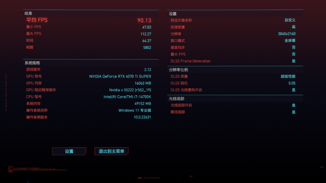 《赛博朋克2077》基准测试,画质超级,光追设为路径追踪模式,DLSS设为超级性能模式,并开启DLSS 3.0与光线重构设置。4K分辨率下,游戏平均帧率为90.13 FPS。