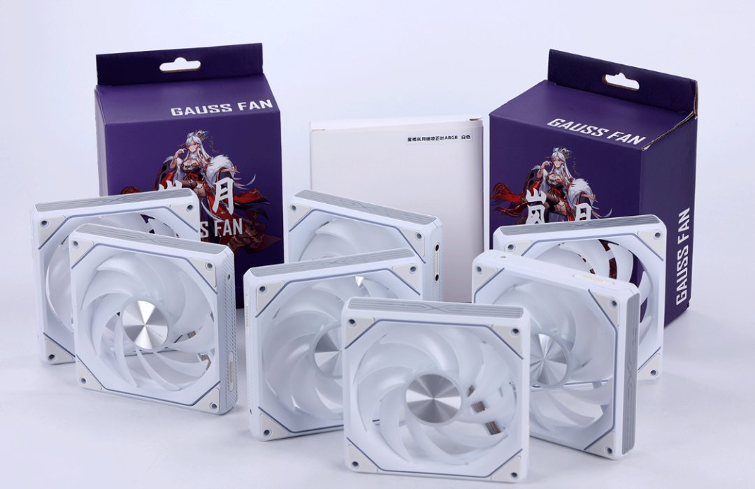 水冷标配三把120mm风扇,白灰撞色设计。太空灰配色的聚流型内框搭配三面镂空的白色边框,质感表现优秀。内外边框连接处还有隐藏ARGB灯带设计。轴心CD纹金属装饰贴以及镂空处的铝合金边框装饰,也让风扇质感更上层楼。风扇采用FDB原厂静音轴承和高转速马达,最大转速可达2200±10%RPM,搭配上8片流线型高强度扇叶,最高可提供74.76CFM的风量和3.72mmH2O的风压,而满载运行时的噪音仅为36分贝