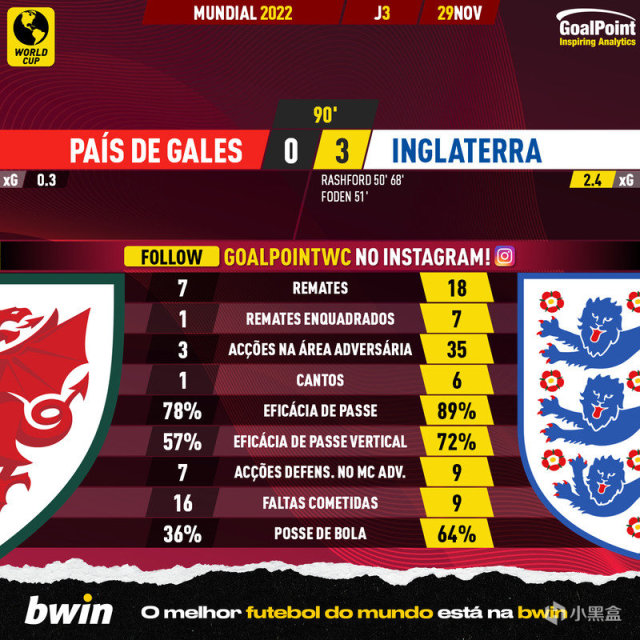 世界杯B组焦点战,英伦德比,英格兰大战威尔士!上半场,凯恩直塞,拉什福德单刀射门,被门将丹尼·沃德出击化解,英格兰多次造成攻门机会!下半场,第50分钟,拉什福德直接任意球破门;第52分钟,凯恩右边路助攻后点的福登破门,三狮军团两分钟两球!第68分钟,拉什福德禁区内连续过人左脚低射破门梅开二度,这场球曼联赢麻了!最终,英格兰 3-0 战胜威尔士,小组头名晋级,16强将面对塞内加尔!