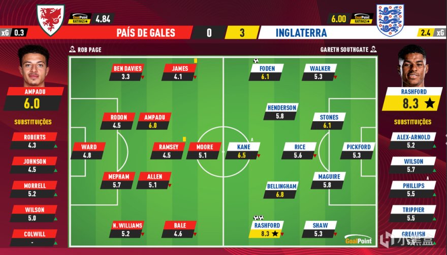 第68分钟,拉什福德禁区内连续过人左脚低射破门,英格兰 3-0 威尔士!第75分钟,摇子换下进球功臣拉师傅!第76分钟,贝林厄姆打门被门将扑出,福登补射打偏!补时第90+1分钟,马奎尔头球助攻,斯通斯球门近距离一脚打高,最终英格兰 3-0 战胜威尔士,16强将面对塞内加尔!伤感的是,我们也将在世界杯杯舞台上告别贝尔,大圣再见......