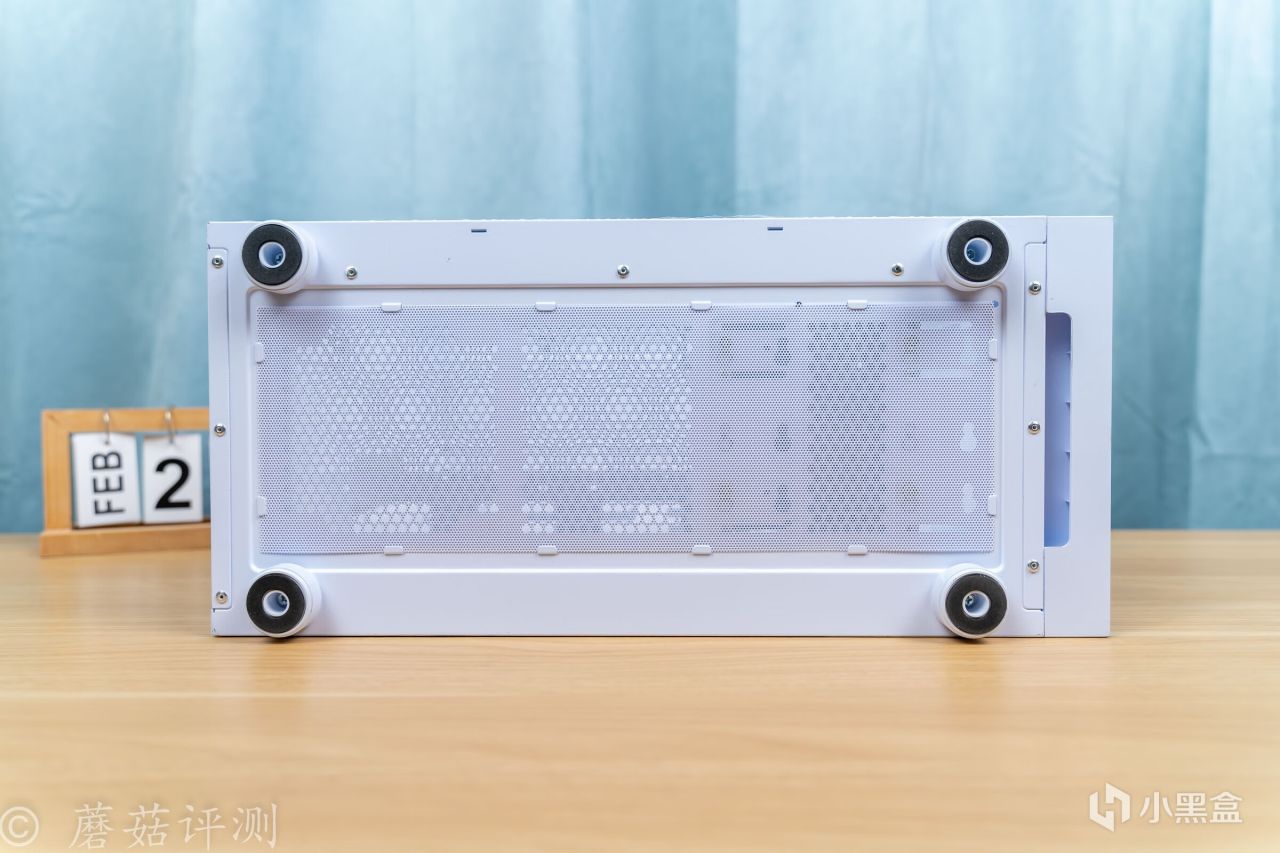 ▼机箱底部,四角有四个防滑泡棉,中间是大面积的金属防尘网。