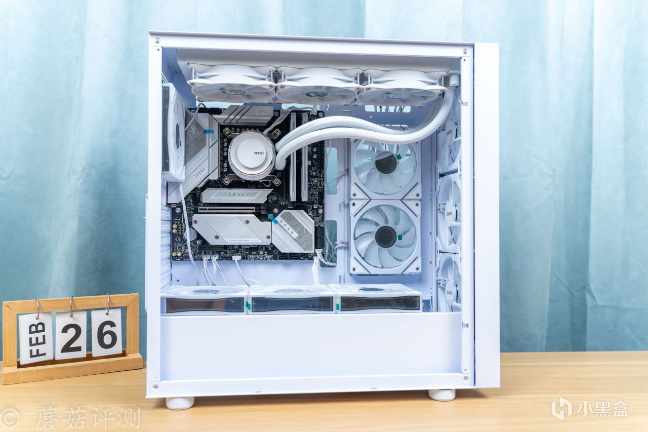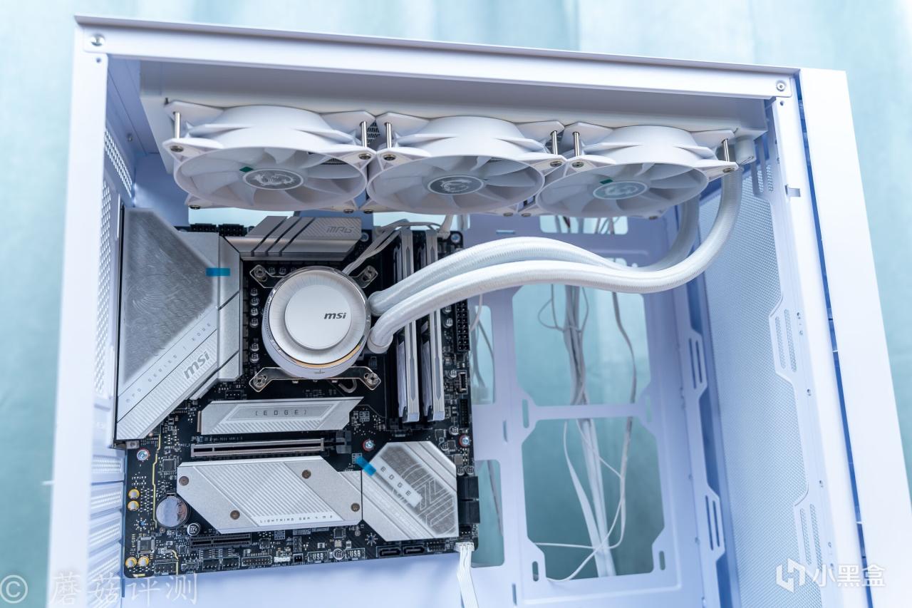 ▼处理器是13700K,默频满载功耗在240W左右,用来压制这颗处理器的是微星的MAG CORELIQUID E360 WHITE寒冰白色限定版,这款水冷的颜值非常漂亮,整体采用白色的配色,水冷头、水管、水冷排以及冷排风扇都是白色的,搭配白色主题的机箱非常合适。