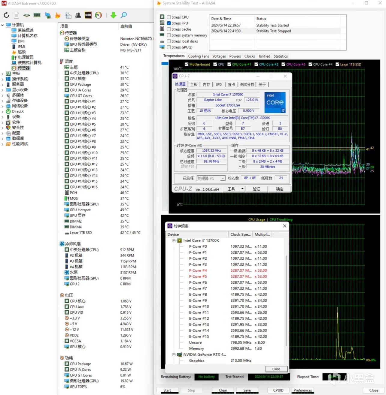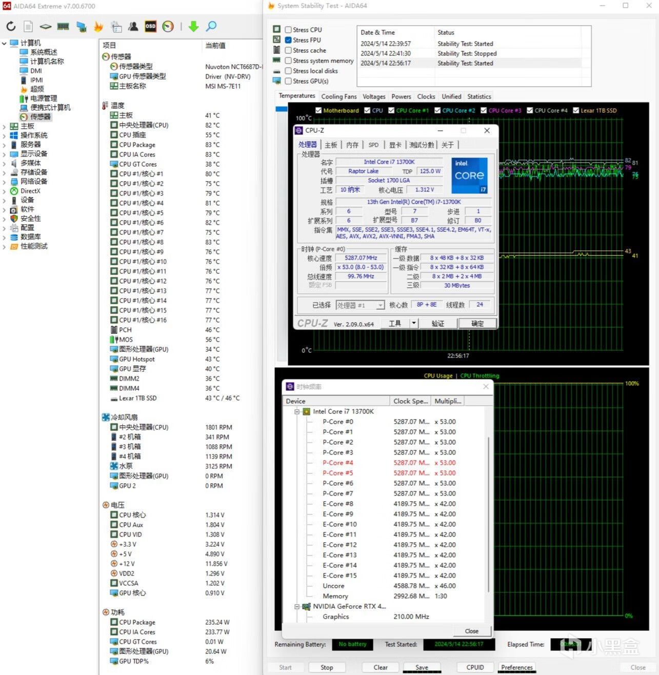 ▼单烤FPU测试,处理器功耗在235W左右,大核心睿频5.3GHz,小核心睿频4.2GHz,温度82℃,南桥46℃,供电56℃,显卡核心34℃,固态43、46℃。