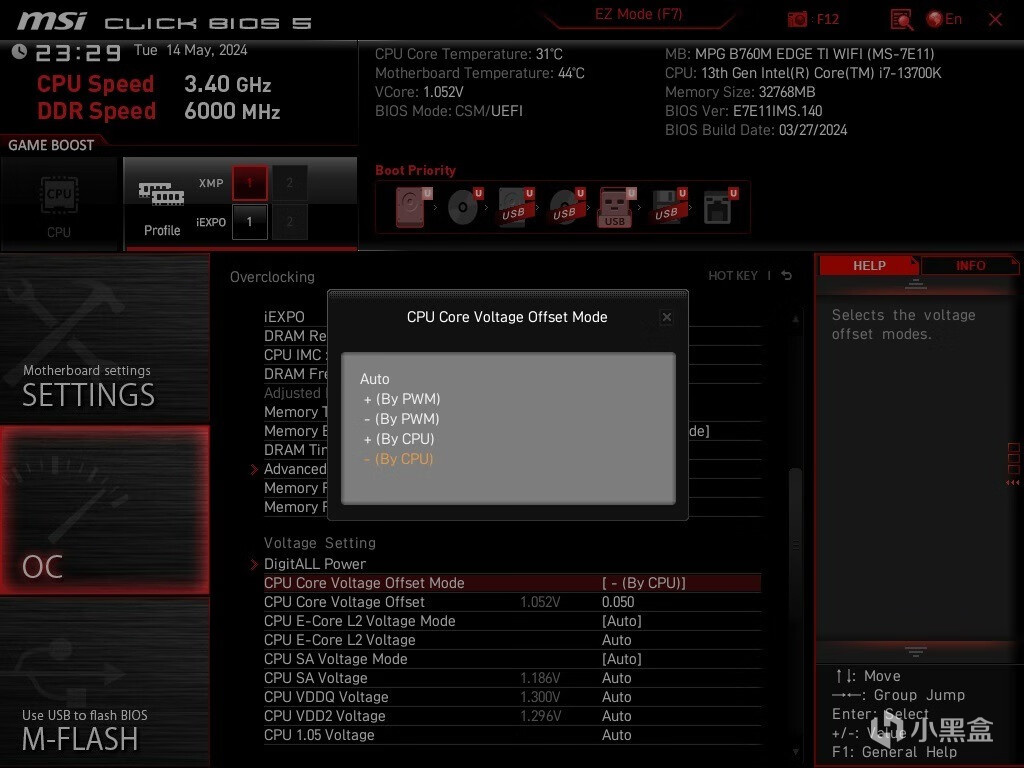 ▼在处理器核心电压方面,蘑菇个人比较喜欢“-(By CPU)”这个降压模式,效果明显,且功耗给的很给力,可以让13700K的多核性能充分发挥。蘑菇的这颗13700K处理器体质一般,降压设置的是0.05。