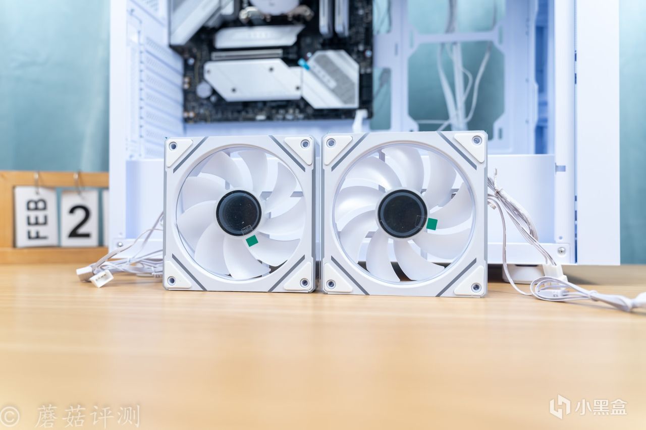 ▼水冷排的冷排风扇扇叶也是乳白色的,柔光效果非常不错,支持ARGB灯效,支持主板同步。