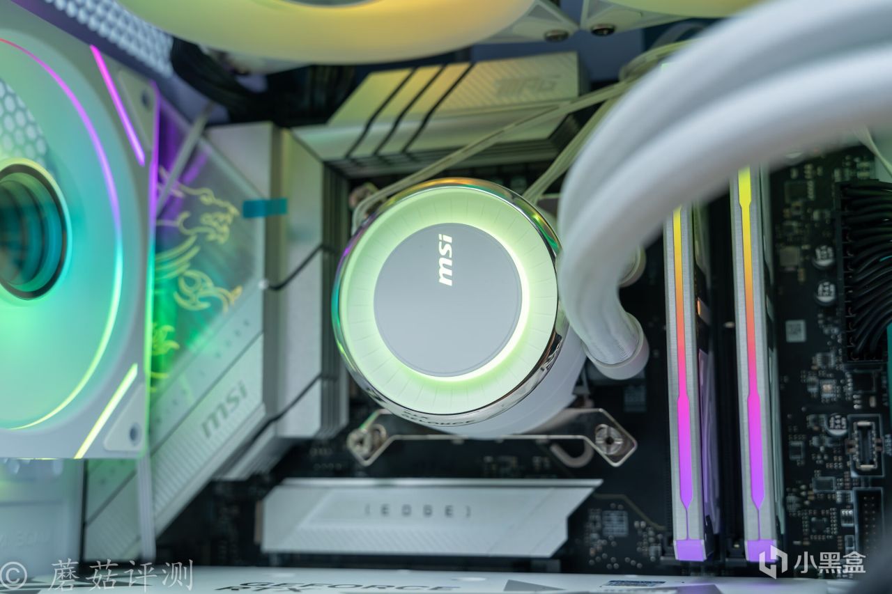 ▼水冷是微星的MAG CORELIQUID E360 WHITE寒冰白色限定版,这款水冷的水冷头设计的很漂亮,中间有一个圆形的造型,侧面有一圈RGB灯带。