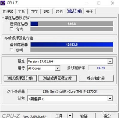 ▼跑个CPU-Z的性能测试,单核得分846.8,多核得分12483.6,单核得分会有波动,这个分数也比较正常,多核得分就非常漂亮的,可以跑到1.25W左右,且温度控制的很优秀。