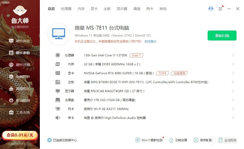 ▼整机配置一览,处理器是13700K,主板是微星的MPG B760M EDGE TI WIFI刀锋钛主板,显卡是影驰的RTX4080 Super星曜OC。