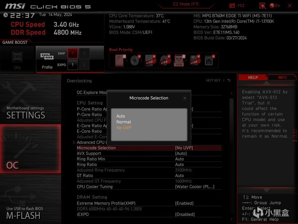 ▼在主板的BIOS中,选择“No UVP”,也就是微星的B760主板的104微码选项。