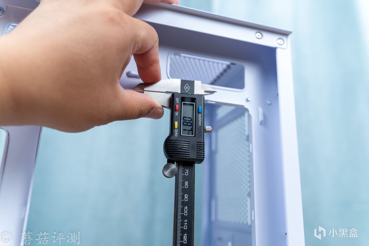 ▼简单测量下机箱的五金厚度,大约在0.87mm,用料可以。