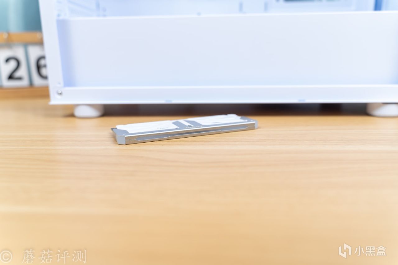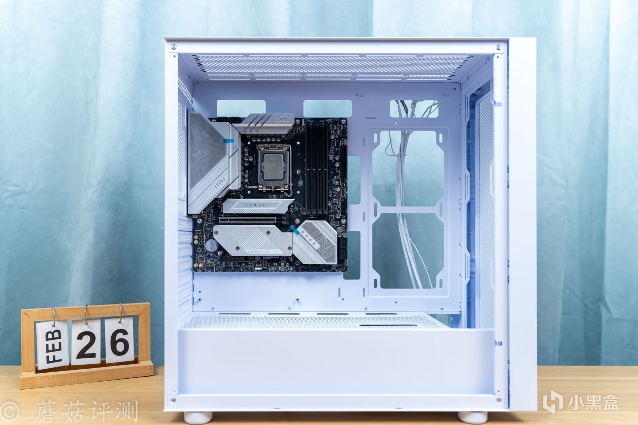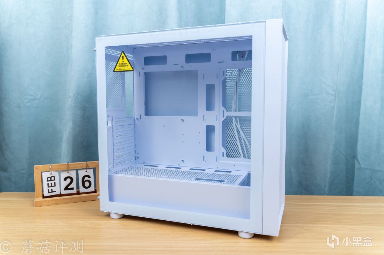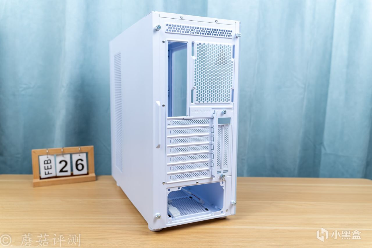 ▼机箱侧面的侧透面板采用推拉式设计,玻璃面板四角有包边处理。机箱内部,左侧是主板固定位,四周有丰富的走线孔,侧面还有两个机箱风扇位。