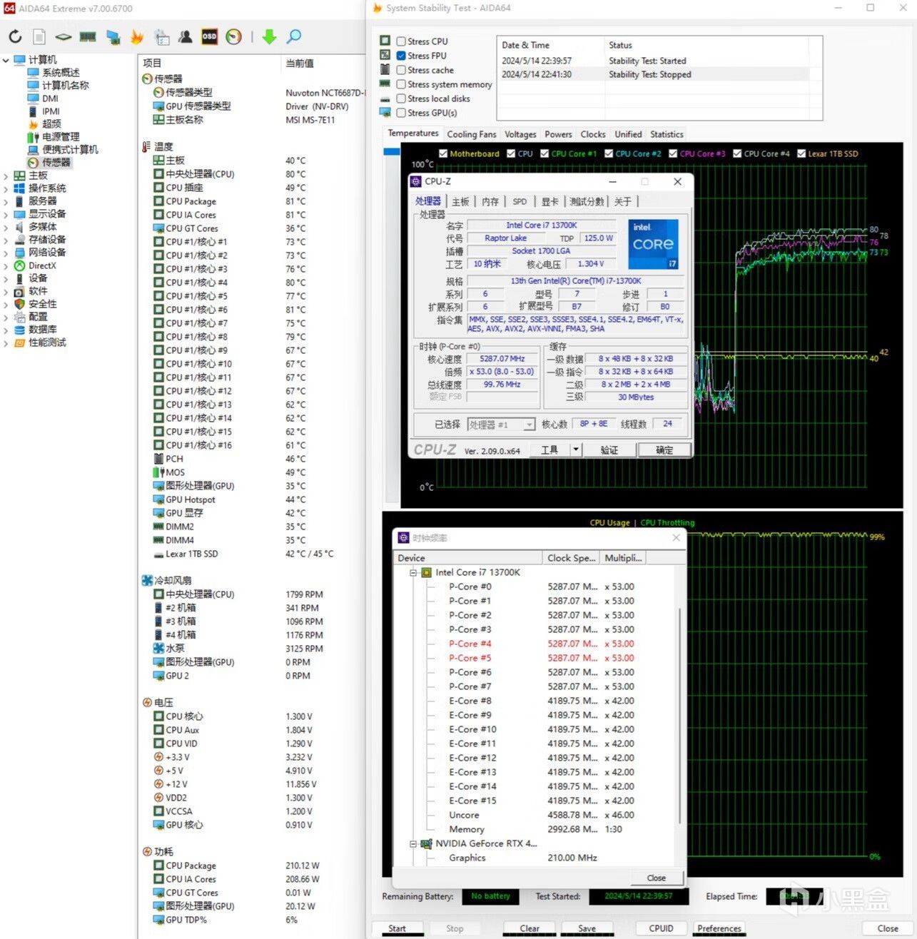 ▼简单跑个CPU-Z的压力测试,处理器功耗在210W左右,大核心睿频5.3GHz,小核心睿频4.2GHz,温度80℃,南桥46℃,供电49℃,显卡核心35℃,固态42、45℃。